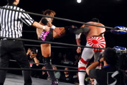 矢郷コーナーに振る、菊地切り返して串刺しエルボーから串刺しゼロ戦キック(右写真)。