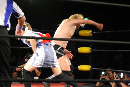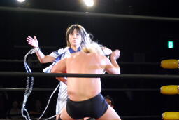 ショルダーブロックは大家優勢(右写真)。大家いきなり鎖を外すと場外に。「俺のほうが不利なんだもん!」いや今さらそんなことを言われても。