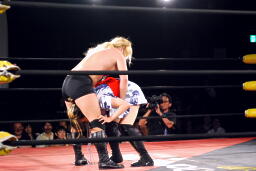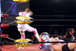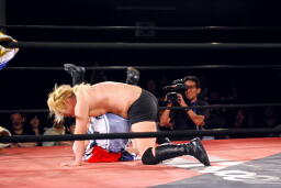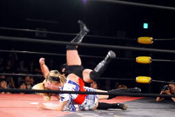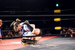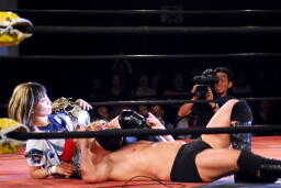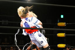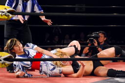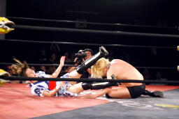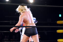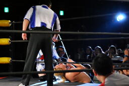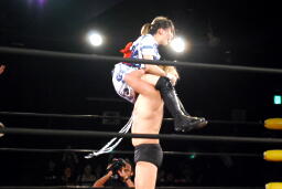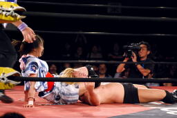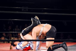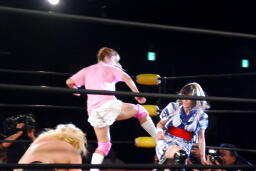 美央ミサイルキック、カウント2。ハイキック、大家かわしてスクールボーイ(左写真)、カウント2。
