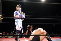 美央「何勝手にタイトル戦決めてんだよ!ここで巻いたベルト、他の誰にも、チェリーのババアにも絶対渡さねえ!」(右写真)ババア・・・。