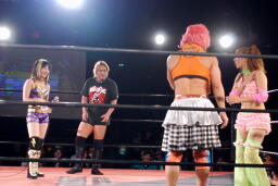 「年齢サバ読んでんじゃねえ!」と挑発する大家を殴り倒したチェリー、そこに美央も手を出して試合開始(左写真)。