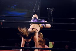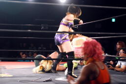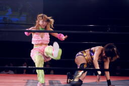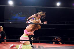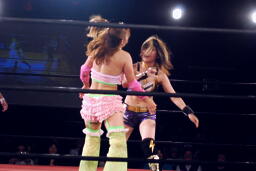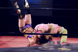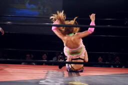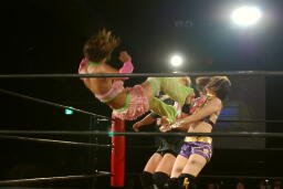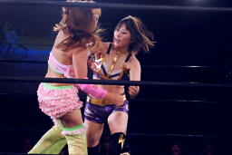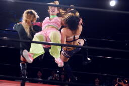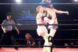 美央ロープに飛ぶ、チェリーはアームドラッグ(左写真)、