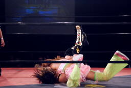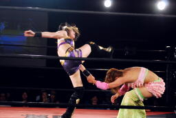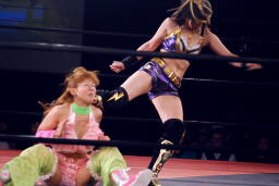 チェリー春夜恋狙う、美央ブレークして立ち上がると「もらった!」と後頭部にキック(右写真)。5分経過。