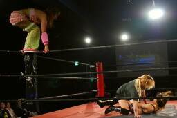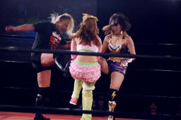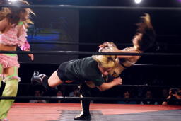 チェリーが美央をロープに振る、美央切り返してドロップキック、しかし向こう側で大家がチェリーの足を引っ張ったため美央自爆(左写真)。