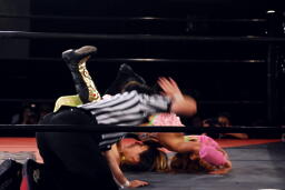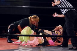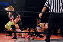 チェリーもう一本の腕も取って美央を転がすと欧州式エビ固め(左写真)、カウント2。