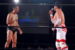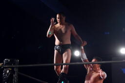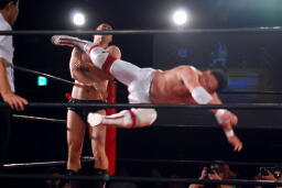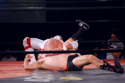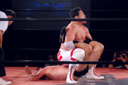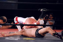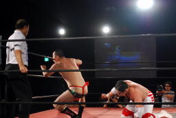 逆エビ固め(左写真)、RGギブアップ。しかし菊地がブレークしないため和田京平レフェリーは菊地の反則負け宣告。