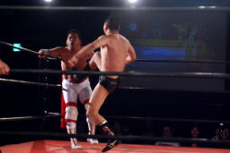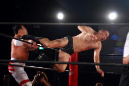 「飛べよ!」と京平にまで言われたRG、エプロンに上がった菊地にドロップキック(右写真)、場外に降りる。