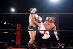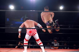 RG正面跳びドロップキックで先制(右写真)。
