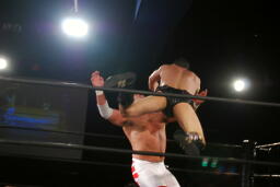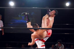 菊地再度フィッシャーマンズスープレックス(左写真)、カウント2。