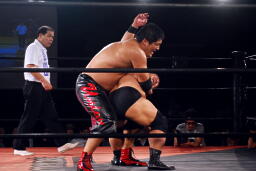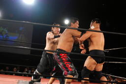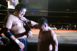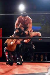石川は大家を場外に出して高木にコブラツイスト(左写真)、高木はエプロンに上がってきた大家に石川をぶつける。