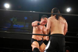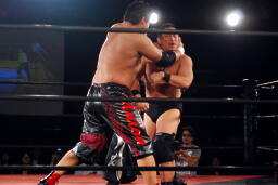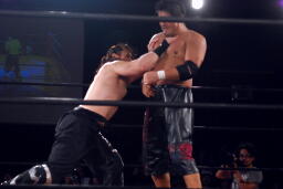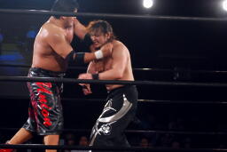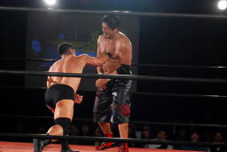 石川大家にヘッドバット、場外に出す。高木が石川にチョップ(左写真)、