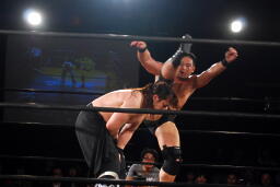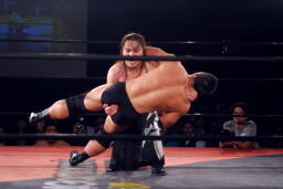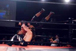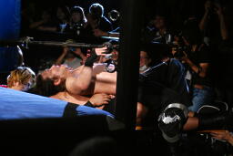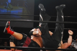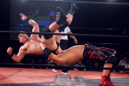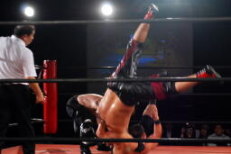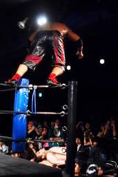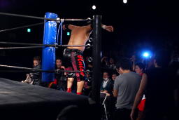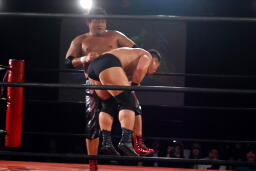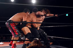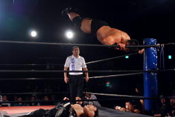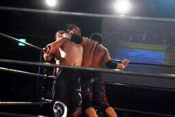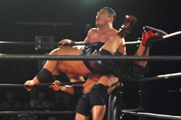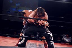 石川ジャイアントプレスを狙ってコーナーに上る、高木も上って雪崩式ブレーンバスター狙う、石川ブロック。大家が高木を捕え裏摩周に(左写真)