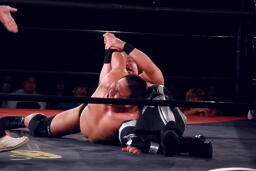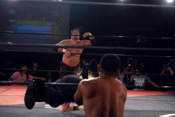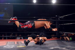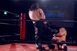 セカンドコーナーからダイビングフットスタンプ(右写真)、大家がリングに戻ってカット。