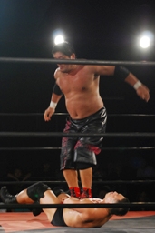 石川は高木をボディスラムで寝せるとエプロンからダブルフットスタンプ(右写真)。大家がキック、ヒザ蹴り。石川をリングに戻す。