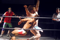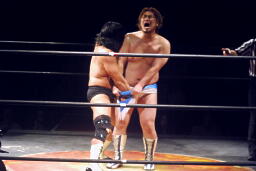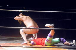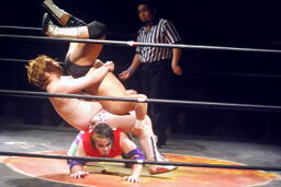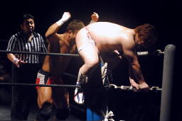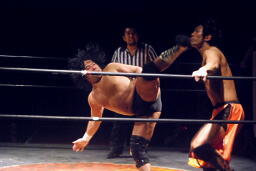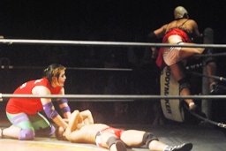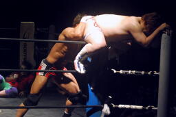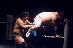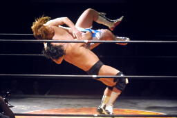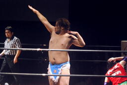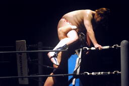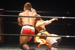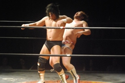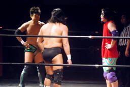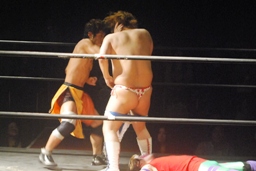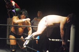 GENTAROは矢野にクローズライン、ディーノにパワーボムを狙うが(右写真)ディーノはGENTAROの顔面にピストン運動。