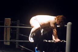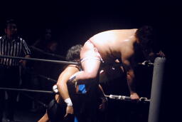 矢野が諸橋を押さえ、武藤にムーンサルトプレス指示、武藤コーナーに上がるがヒザの痛みで足を滑らす(右写真)。そのまま場外に転落、失格。