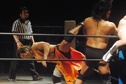 4番目の矢野啓太入場、諸橋パンチ、コーナーに振って串刺しエルボー。武藤が諸橋にシャイニングウィザード(左写真)。