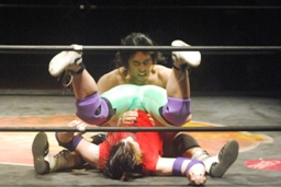GENTAROがジャックナイフ、矢野も上から押さえ込んでカウント3(右写真)、ディーノ失格。