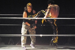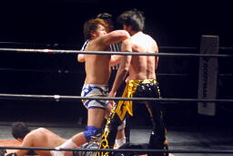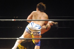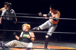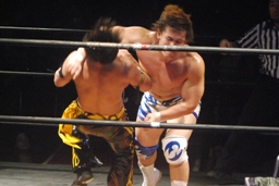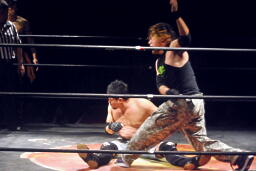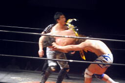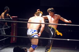KUDOミドルキック(左写真)、ヒザ蹴り。藤田エルボー、逆水平。KUDOミドルキック、藤田逆水平。義人にタッチ。義人逆水平、ボディスラムからエルボードロップ、カウント2。藤田にタッチ。藤田はKUDOを場外に出す。