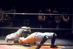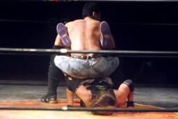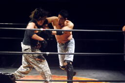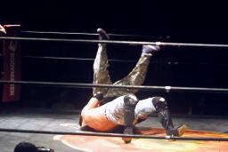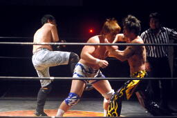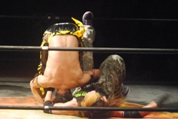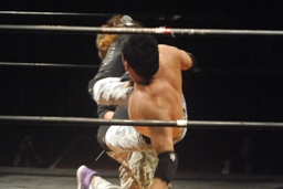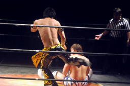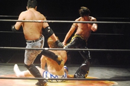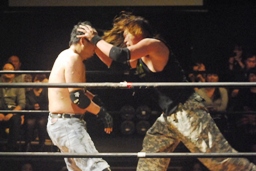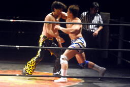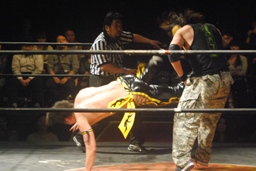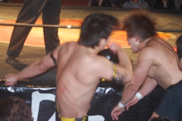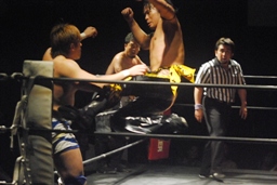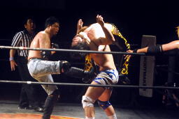 伊東エルボー(右写真)、KUDOにタッチ。藤田KUDOにもエルボー、KUDOもエルボー、首投げからサッカーボールキック。ネックロック、藤田コーナーに押し込んで義人にタッチ。