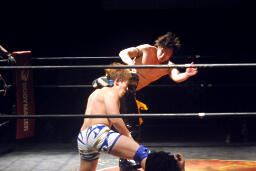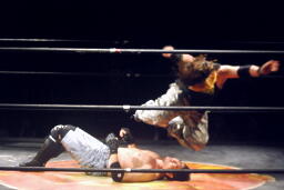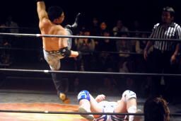 伊東パンチ、藤田が入って延髄蹴り打つが義人に誤爆。伊東はボディスラムからエルボードロップ(右写真)、カウント2。伊東ヒザ蹴り、義人キャッチしてコーナーに押し込み藤田にタッチ。