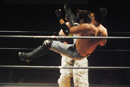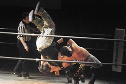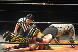 伊東が場外ボディスラム、リングに戻し逆エビ固め(右写真)。KUDO戻って藤田の背中に倒立式ダブルニードロップ、カウント2。