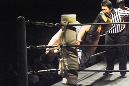 伊東コーナーに振る、義人切り返して突っ込むが伊東はタランチュラに(左写真)。KUDOにタッチ。10分経過。