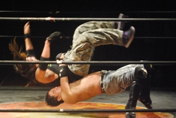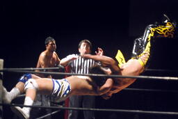 伊東ボディスラムからムーンサルトプレス、義人がカット。KUDOが義人を場外に。伊東はドラゴンスプラッシュ狙ってコーナーに上る、藤田も上り雪崩式ブレーンバスターの体勢に、伊東ブロック。義人が入って裏摩周の形で2人とも投げる(右写真)。