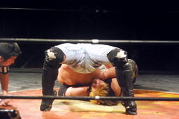 KUDOコーナーに上る、義人も追う。コーナー上での攻防の末に義人が雪崩式ブレーンバスターで投げる(左写真)、カウント2。