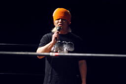 ウラノあいさつ(右写真)。「プロレス大好きな選手を集めましたので楽しめると思います。」はいいが「最後まで楽しんで行ってください」を2回繰り返すなど、事前に考えてなかったのがありあり。