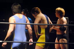 大地ロープに飛ぶ、HIROKIキャッチしてスリーパー、リリースしてチンクラッシャー(左写真)、ソバット。クローズラインからカバー、カウント2。