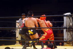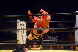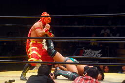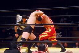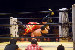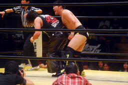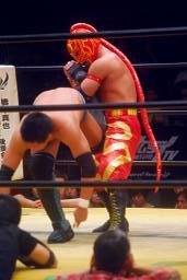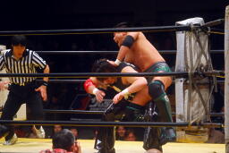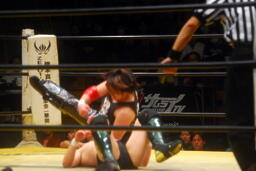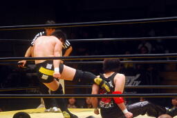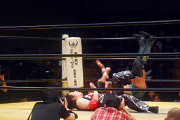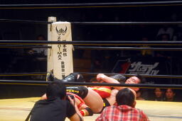 菅原首投げからフィストドロップ(右写真)、カウント2。5分経過。