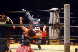 ハブ男パンチ2発、ブレーンバスター(左写真)からセントーン、カウント2。