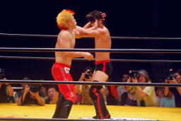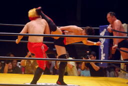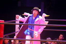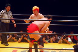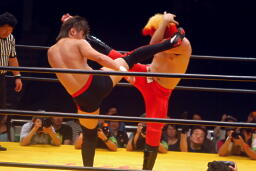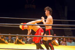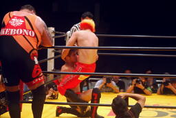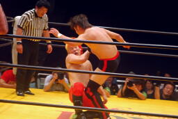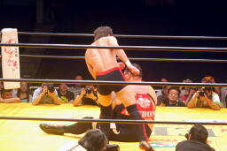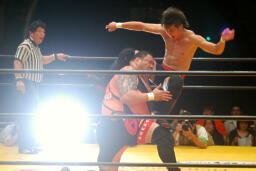 曙串刺しラリアット(右写真)、対角線コーナーに振ってもう一発。しかしボディプレスはかわされる。大谷は大地にタッチ。