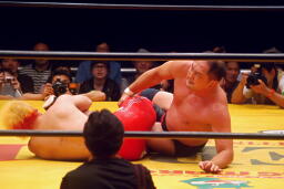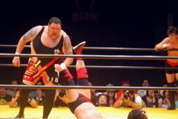 大谷ボディスラム狙うが上がらず(右写真)、曙が逆にボディスラムからエルボードロップ、大谷かわして大地にタッチ。