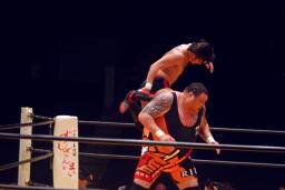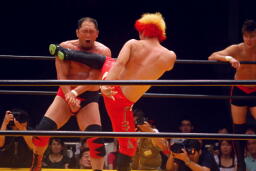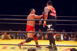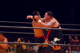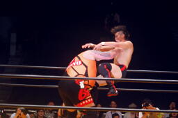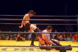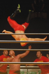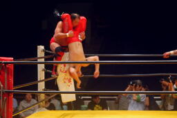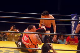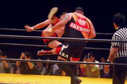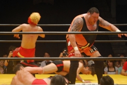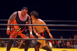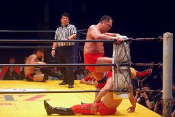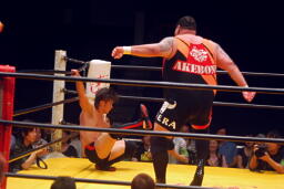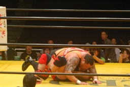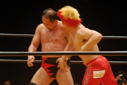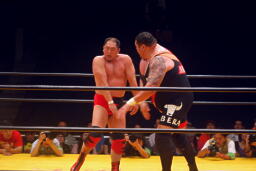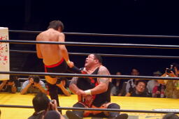 大谷がコーナーに上ると曙がチョップ。自演乙コーナーに上って雪崩式フランケンシュタイナー(左写真)、カウント2。