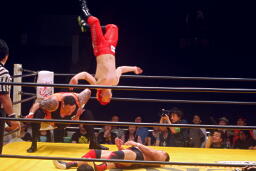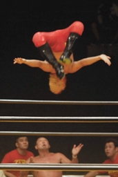 見事な空中殺法(右写真)を披露。しかし大谷が先に立ち上がりチョップ、リングに戻す。