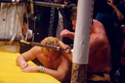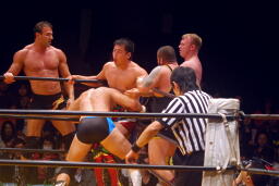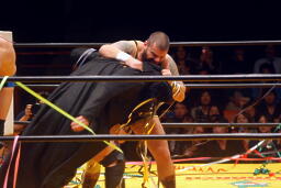 ライディーン崔をコーナーに振ってショルダータックル連発(右写真)。チョーク攻撃、フセインにタッチ。ダブルで踏みつけ。