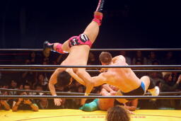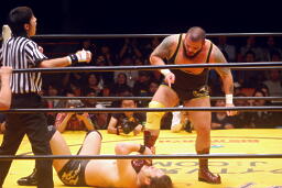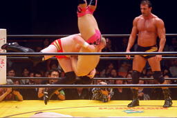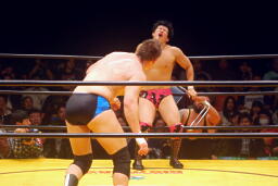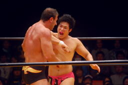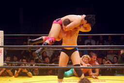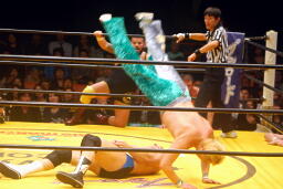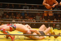崔ブレーンバスター(右写真)、柿沼にタッチ。