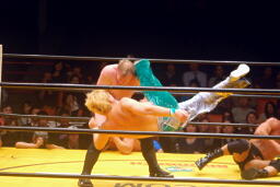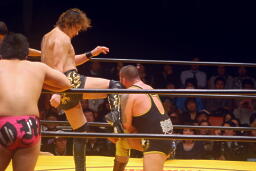 崔フセインにエルボー、首投げからサッカーボールキック(左写真)、柿沼にタッチ。