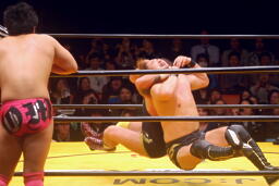 リングに戻すとニーリフト、ブレーンバスター(左写真)、カウント1。ライディーンにタッチ。ライディーンショルダータックル、シークにタッチ。
