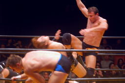 トレイシーボディスラム、コーナーに上ってダイビングギロチンドロップ(左写真)、カウント2。