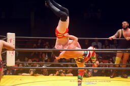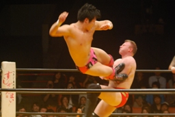 シークランニングネックブリーカードロップ(左写真)、カウント2。KAMIKAZEは耕平にタッチ。