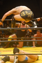 KAMIKAZEムーンサルトプレス(右写真)。