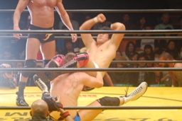 柿沼エルボー(右写真)、フセインは柿沼を場外に出す。場外ではシークが攻撃。