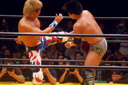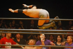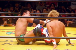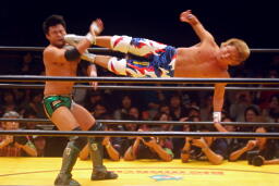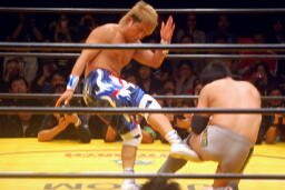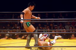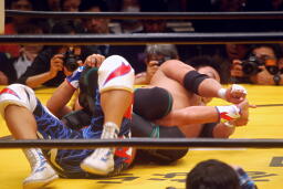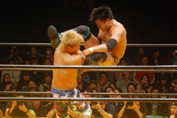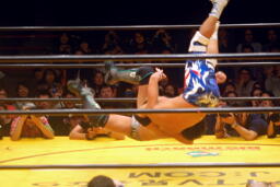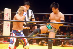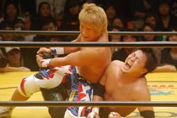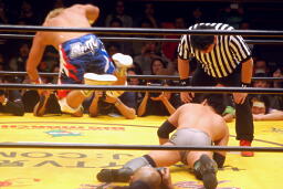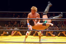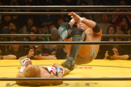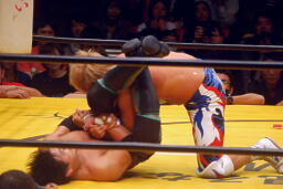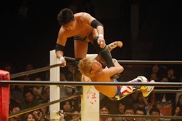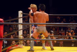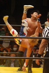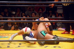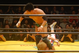 コーナーに上ってミサイルキック(左写真)、リバースDDT、カウント2。