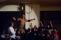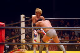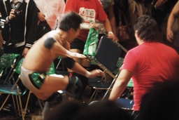 歓声の中、西側客席に突っ込んでいくがそこに日高の姿はなし(右写真)。日高キック連打。5分経過。