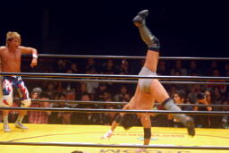 澤リングに戻ると日高をコーナーに振って側転(右写真)、スペースローリングエルボーに。