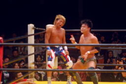 リングに戻るとエルボーの打ち合い、日高はローキックの連打(左写真)。