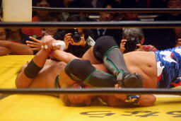 日高絞り上げる(右写真)、澤必死にロープに。10分経過。